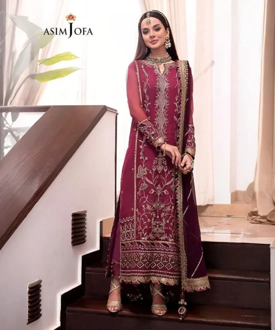 Regal Maroon Embroidered Chiffon Suit with Heavy Gold Sequins