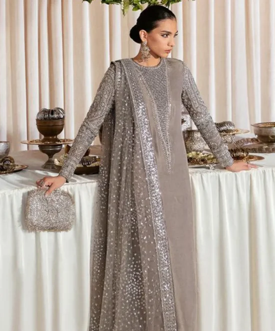 Luxurious Silver-Grey Raw Silk Suit with Crystal and Heavy Sequin Work
