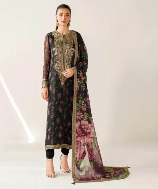 Luxurious Black Digital Silk Suit with Heavy Gold Addawork and Floral Print