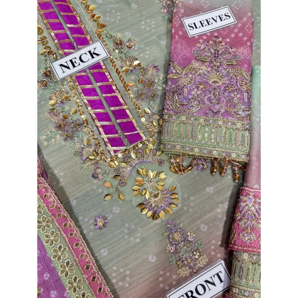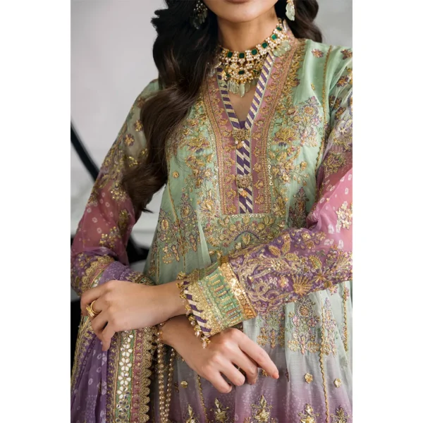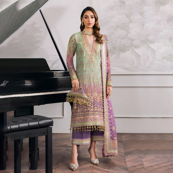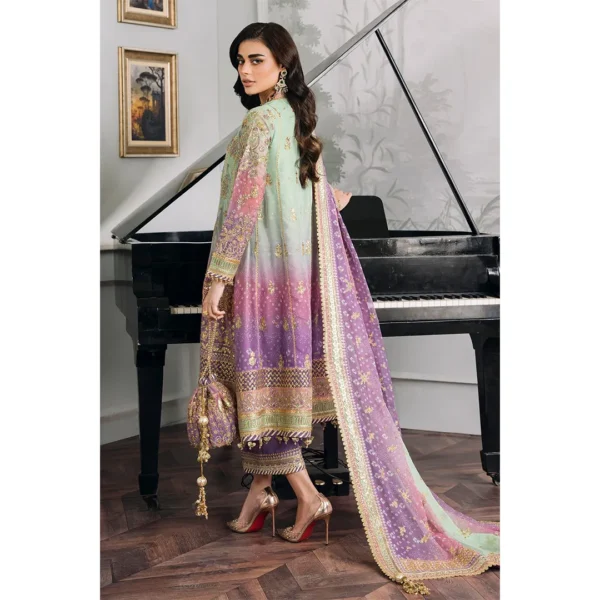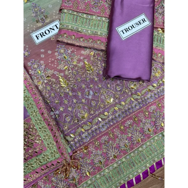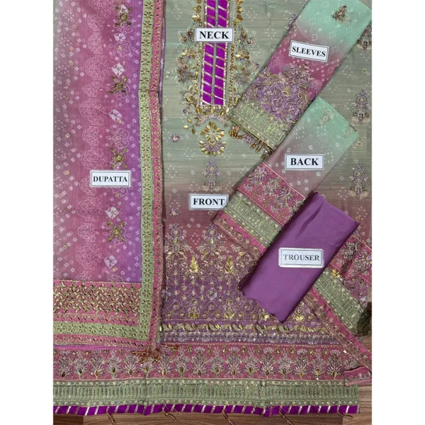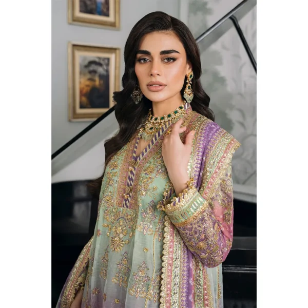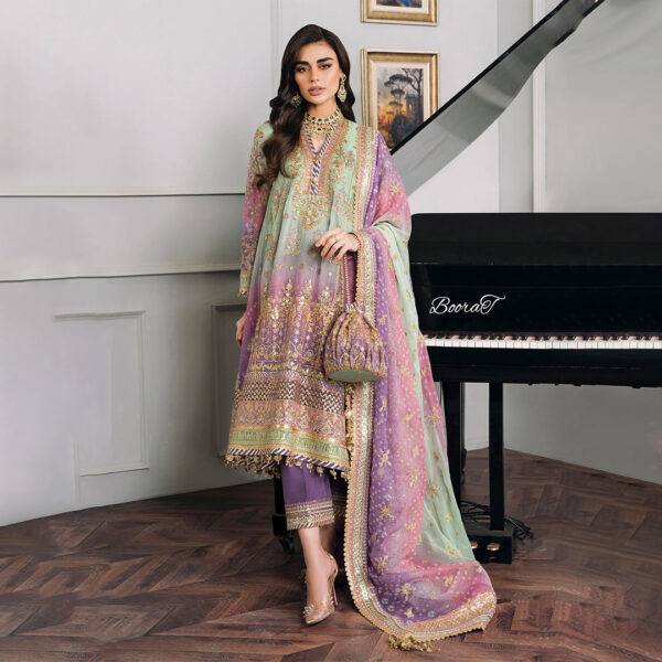 Step out in style with this stunning Unstitched Replica suit, featuring a beautiful ombre blend of Mint Green and Lavender/Magenta. Crafted on luxurious Chiffon with a Silk Trouser, the ensemble is intricately detailed with heavy Sequence and Adda Work for a truly festive and opulent look. Perfect for any grand occasion.