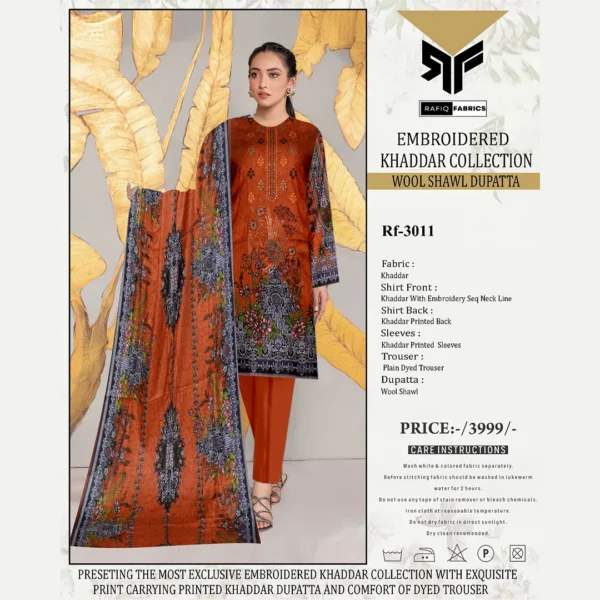 Introducing the Rafiq Fabrics Exclusive Embroidered Khaddar Collection, the perfect blend of traditional elegance and winter comfort. This unstitched three-piece ensemble showcases a meticulously crafted Khaddar shirt, highlighted by delicate embroidery and sequence work along the neckline. The fabric provides a luxurious, warm feel ideal for the cooler months.