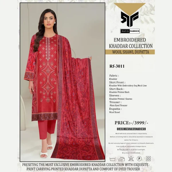 Introducing the Rafiq Fabrics Exclusive Embroidered Khaddar Collection, the perfect blend of traditional elegance and winter comfort. This unstitched three-piece ensemble showcases a meticulously crafted Khaddar shirt, highlighted by delicate embroidery and sequence work along the neckline. The fabric provides a luxurious, warm feel ideal for the cooler months.