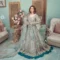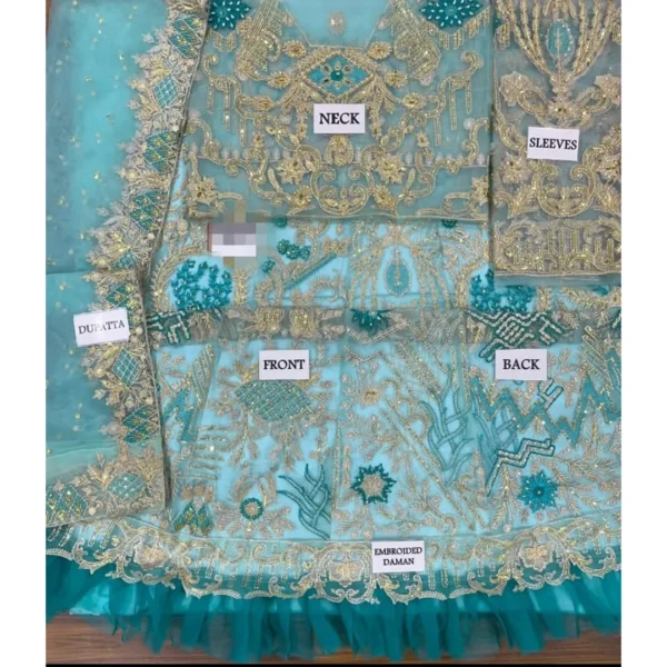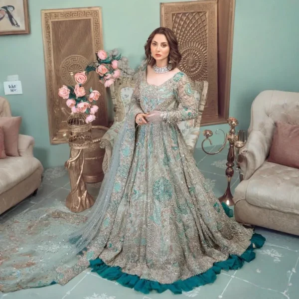 Embrace opulence with this breathtaking 12 Kali Heavy Embroidery Maxi gown, designed for maximum impact at any festive or formal occasion. The outfit is characterized by its dramatic silhouette, featuring an attractive floor frill that complements the expansive approximately 156-inch Ghair (flare) width and matching frill width.