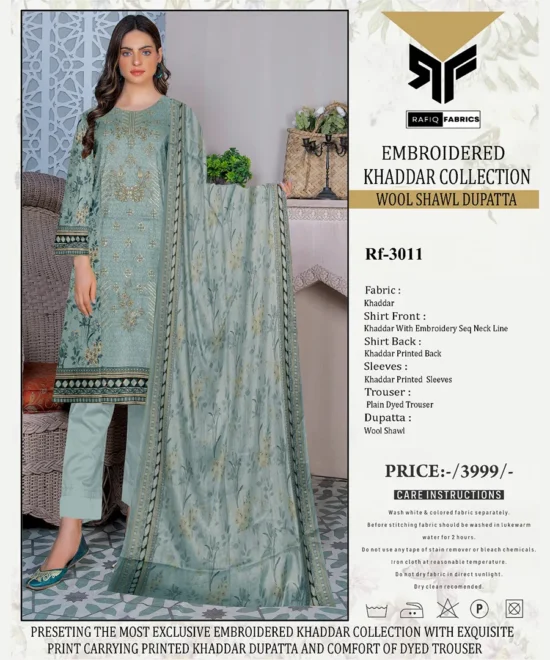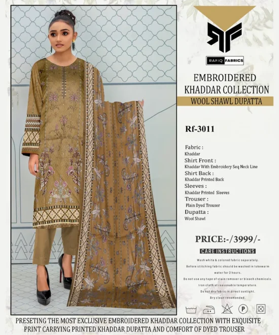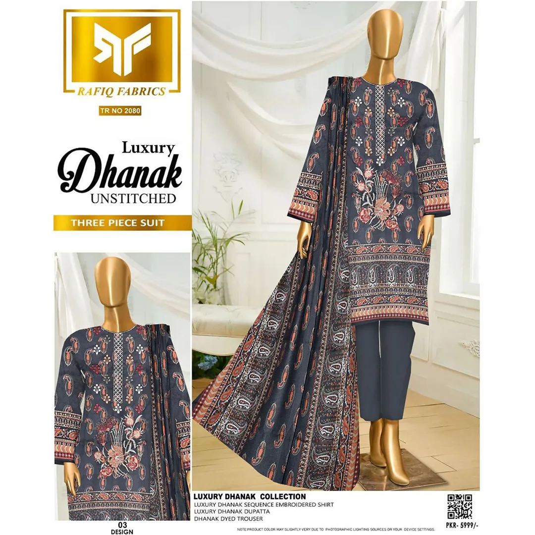 Discover the exclusive Rafiq Fabrics Luxury Dhanak Collection, an unstitched three-piece suit designed for sophistication and warmth. The ensemble is crafted from premium Dhanak fabric, known for its soft texture and excellent drape, making it ideal for semi-formal and casual winter wear.