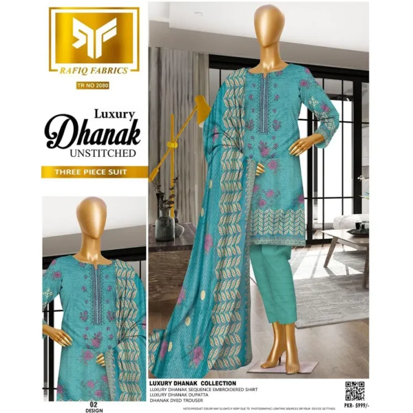 Discover the exclusive Rafiq Fabrics Luxury Dhanak Collection, an unstitched three-piece suit designed for sophistication and warmth. The ensemble is crafted from premium Dhanak fabric, known for its soft texture and excellent drape, making it ideal for semi-formal and casual winter wear.